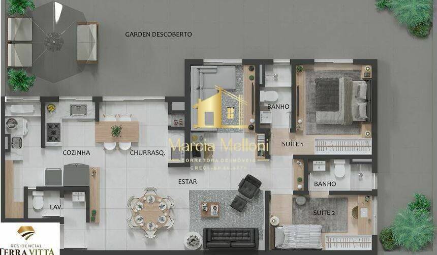Garden 2 suítes (3º dorm. ampliado) , sala para 2 ambientes , cozinha, churrasqueira .